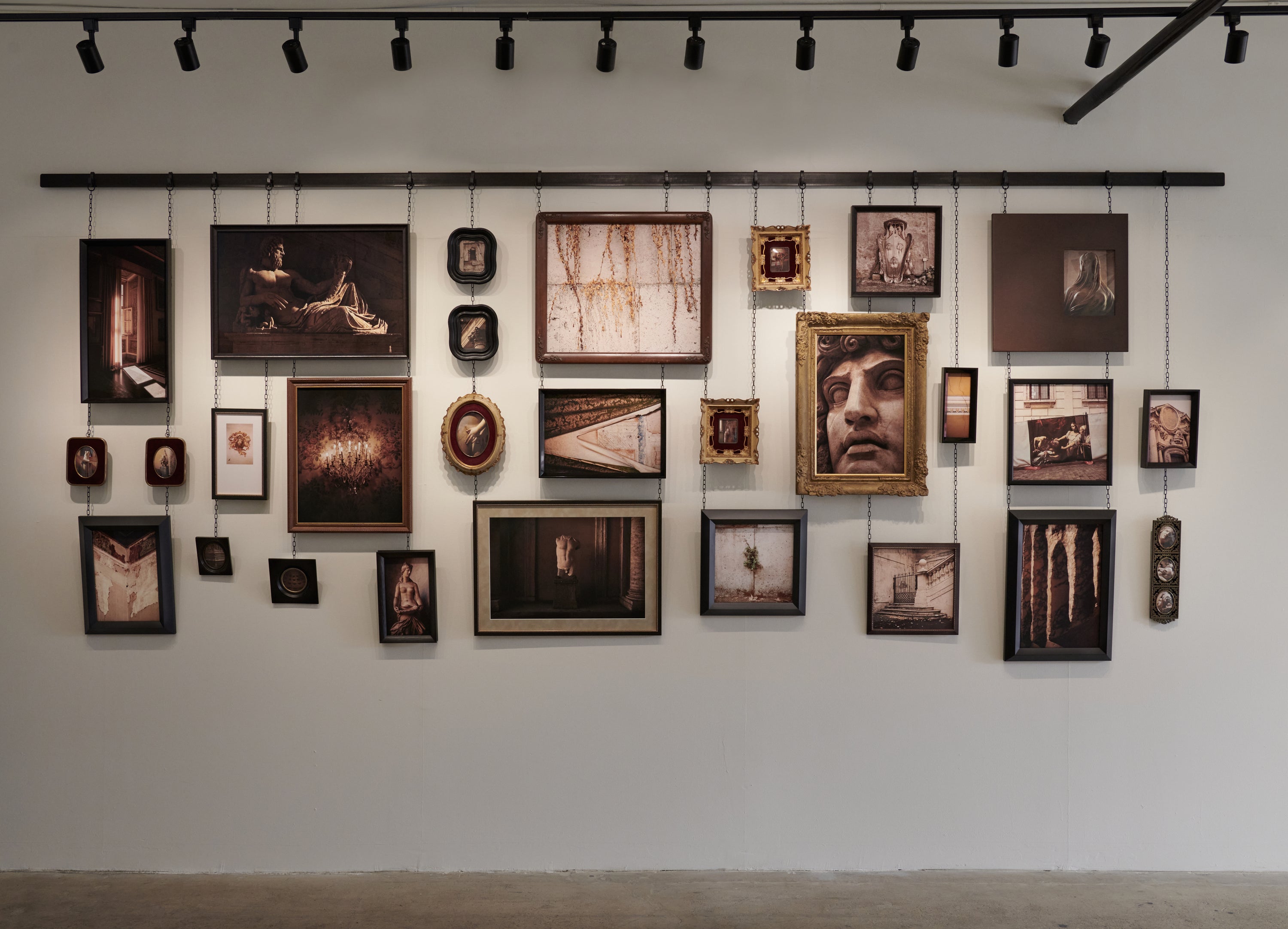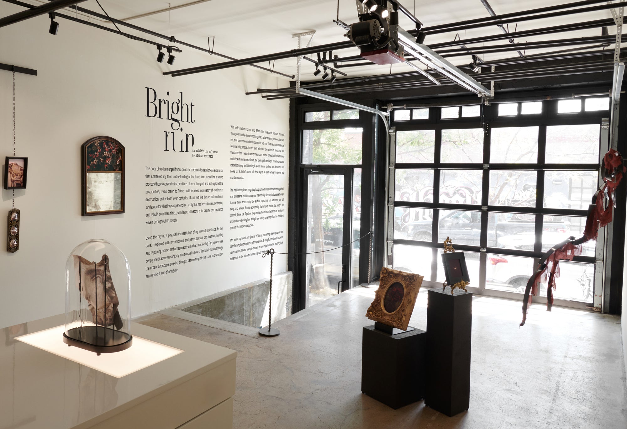 The gallery’s inaugural exhibition, Bright Ruin, is a new series of allegorical photo-based mixed media works and sculptural installations by Atarah Atkinson. Her subject matter draws inspiration from the ruins, art, and architecture of Rome, a city whose layered history has made it the site of continual rebuilding throughout the centuries. Using the city as a physical representation of her internal experience, Atkinson meditates on themes of decay and renewal, beauty and destruction, and the cyclical nature of death and rebirth as it pertains to the self.