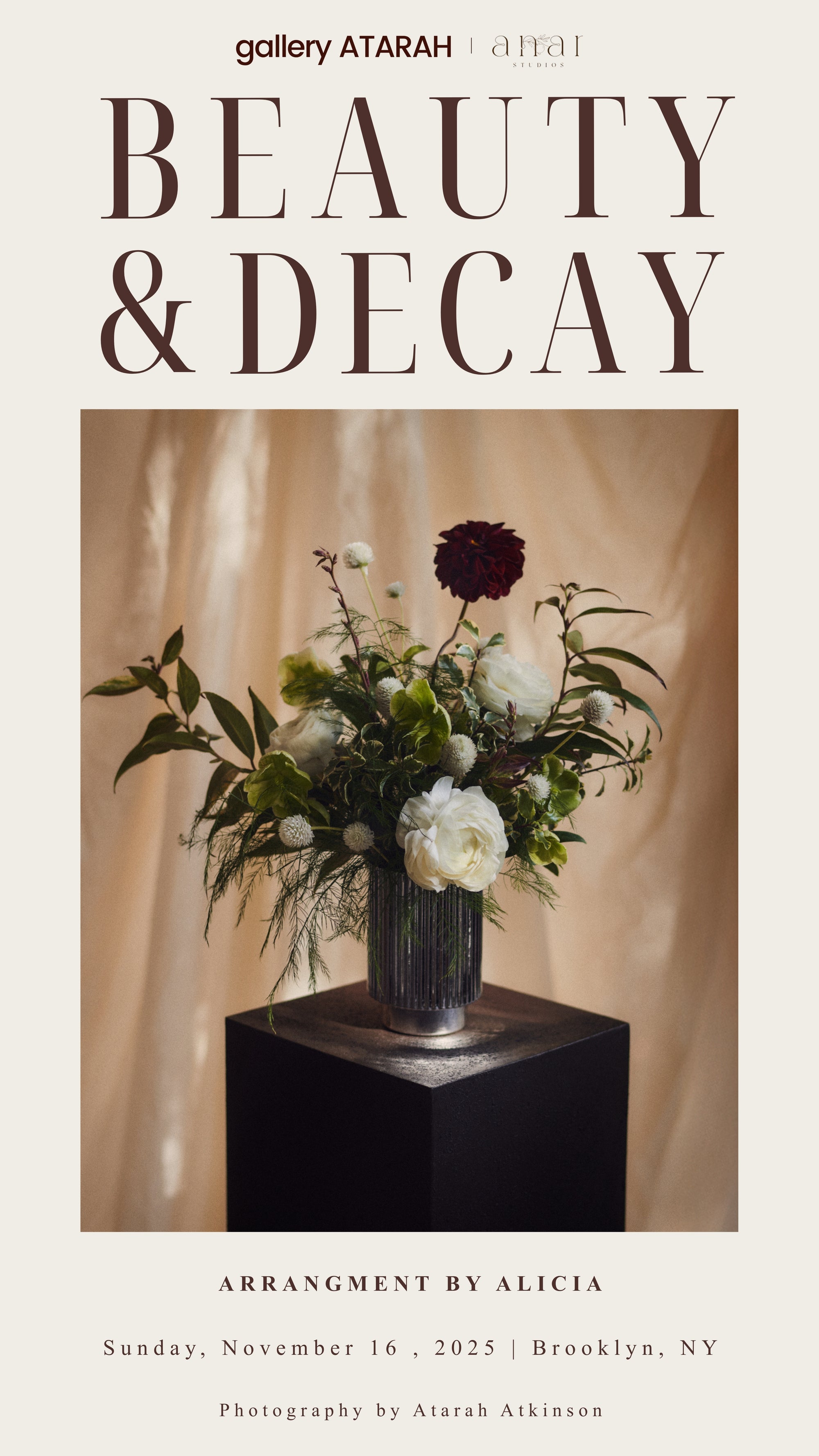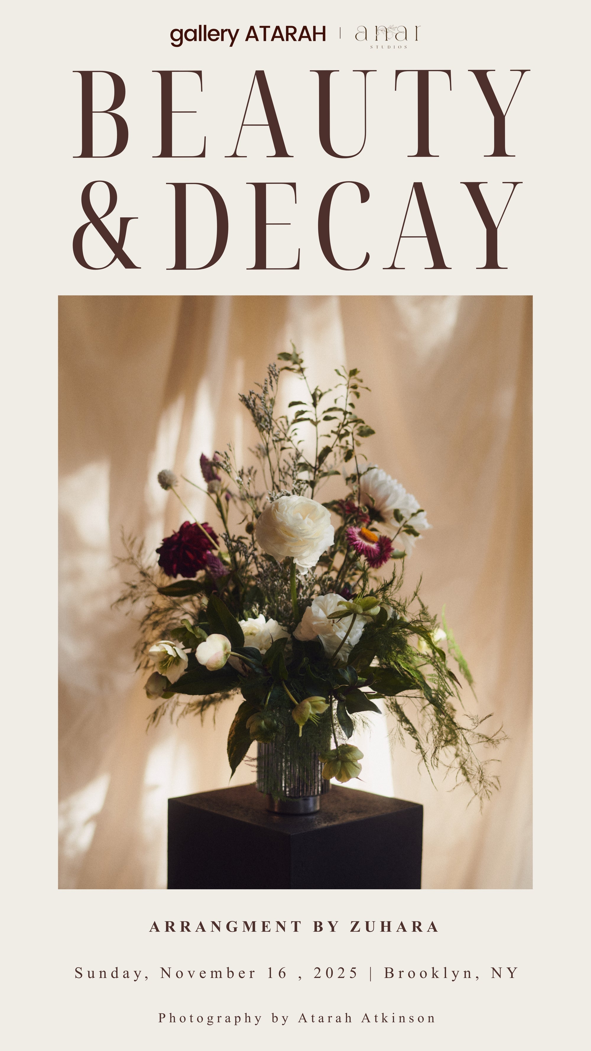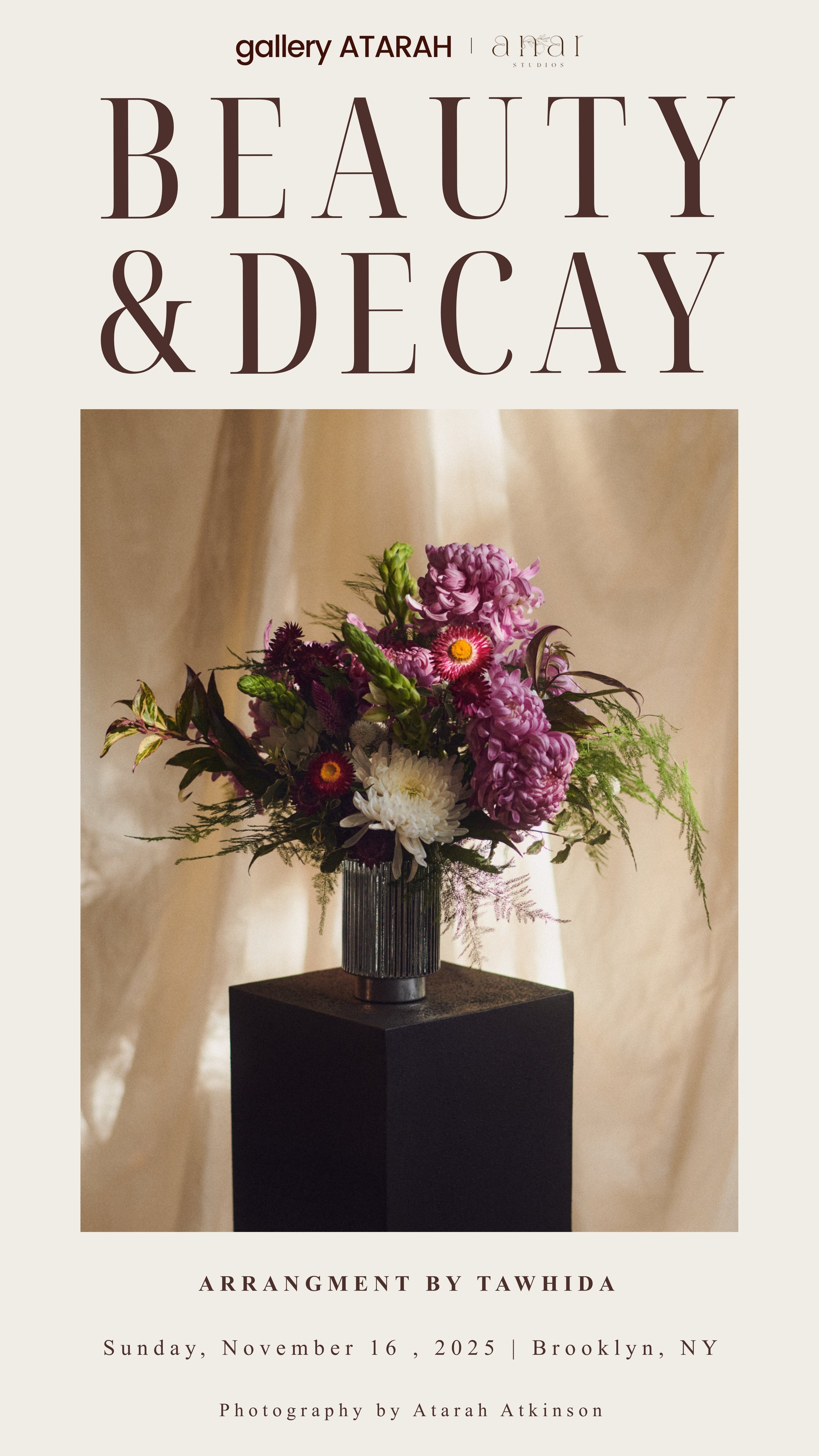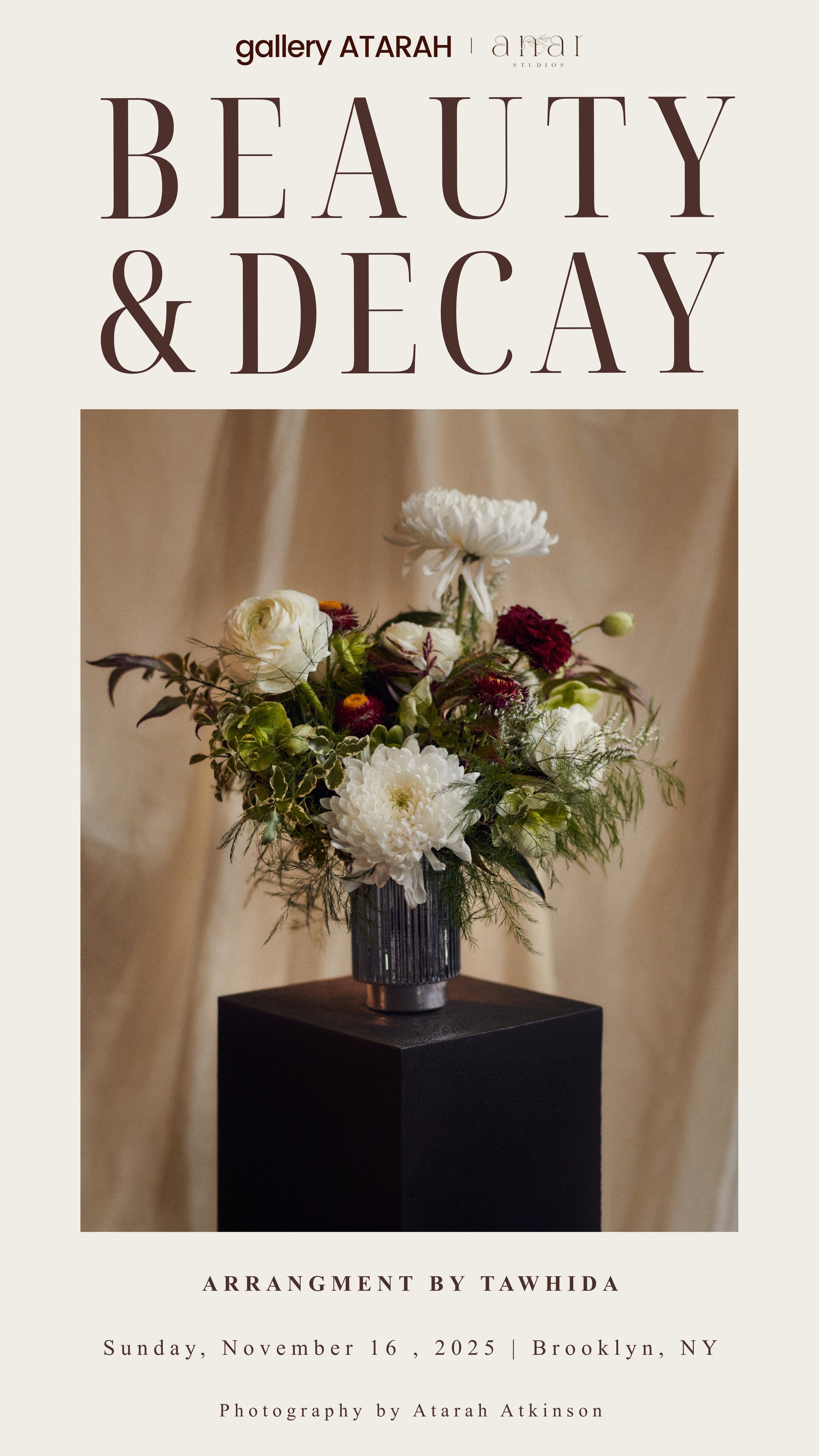Timed to honor the transition out of summer into fall and winter—from fun and ecstasy into a season of reflection, slowdown, and sometimes grief—this workshop invites participants to pause rather than rush through change. Against the backdrop of Gallery ATARAH's inaugural exhibition "Bright Ruin," where everlasting art meets the ephemeral nature of living flowers, you'll be guided to create personal arrangements with respect to texture, shape, and spatial balance. Tawhida and Atarah will also invite you to partake in the act of self-reflection and vulnerability while making your piece of art.