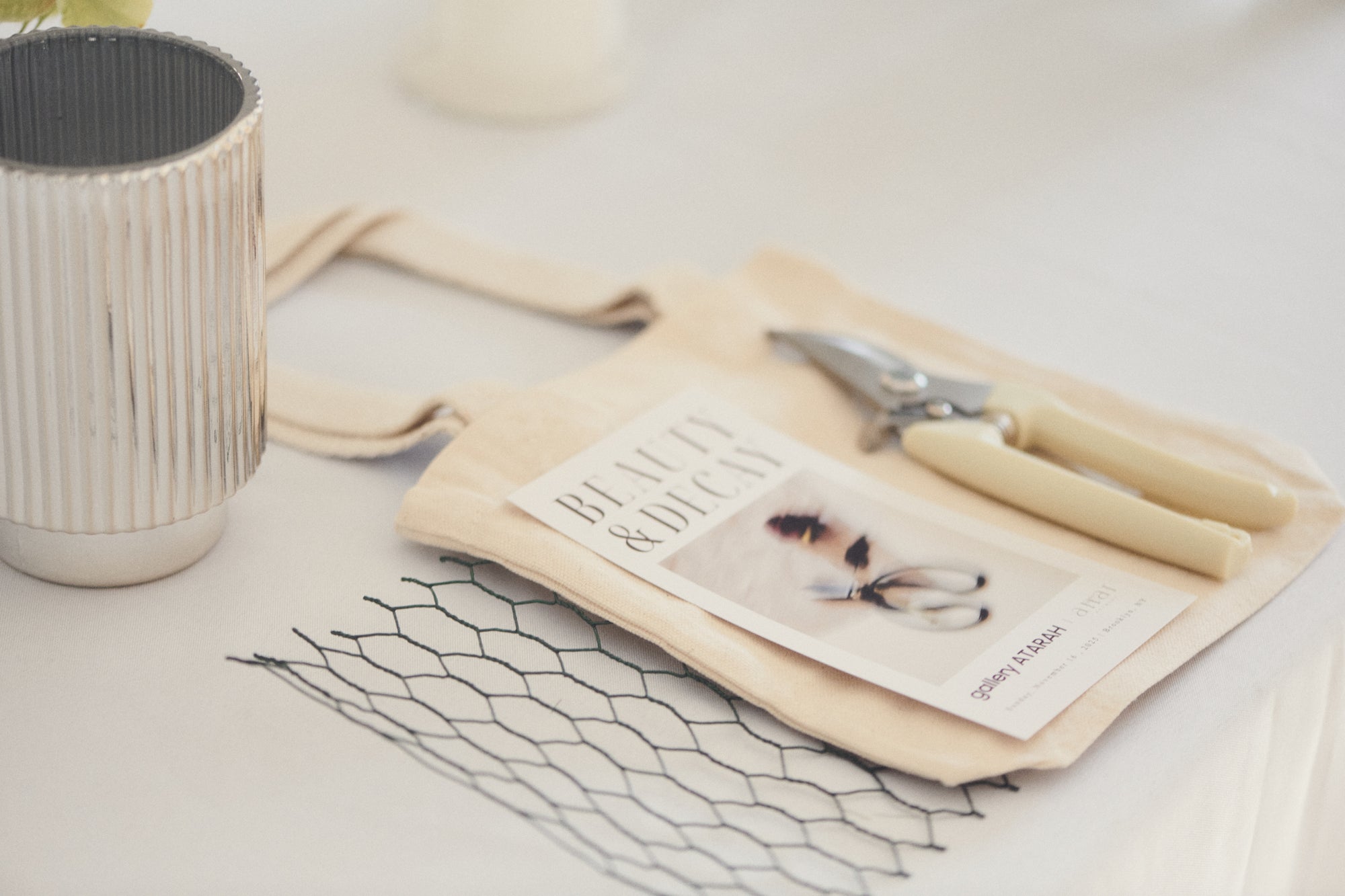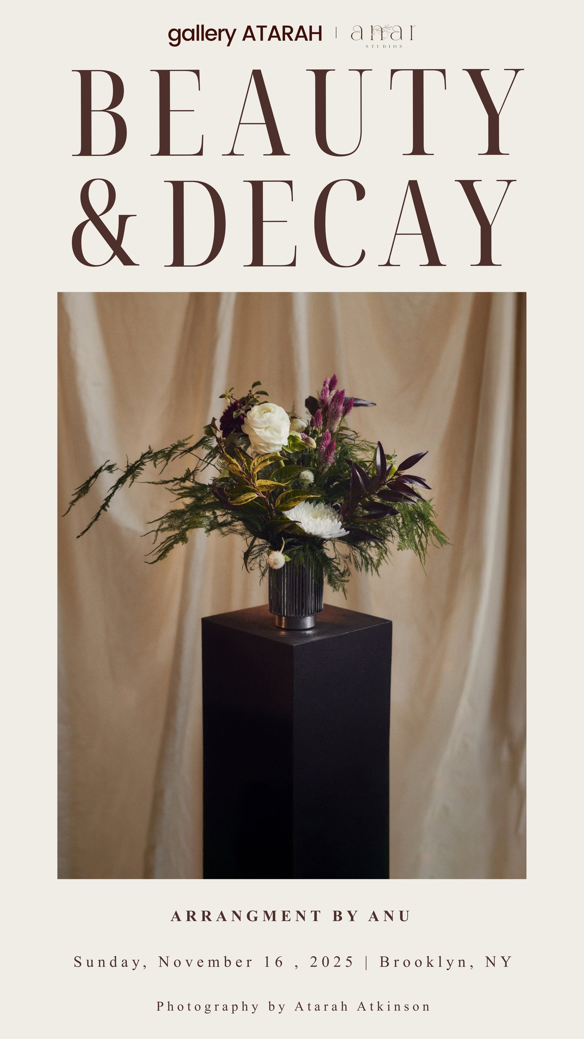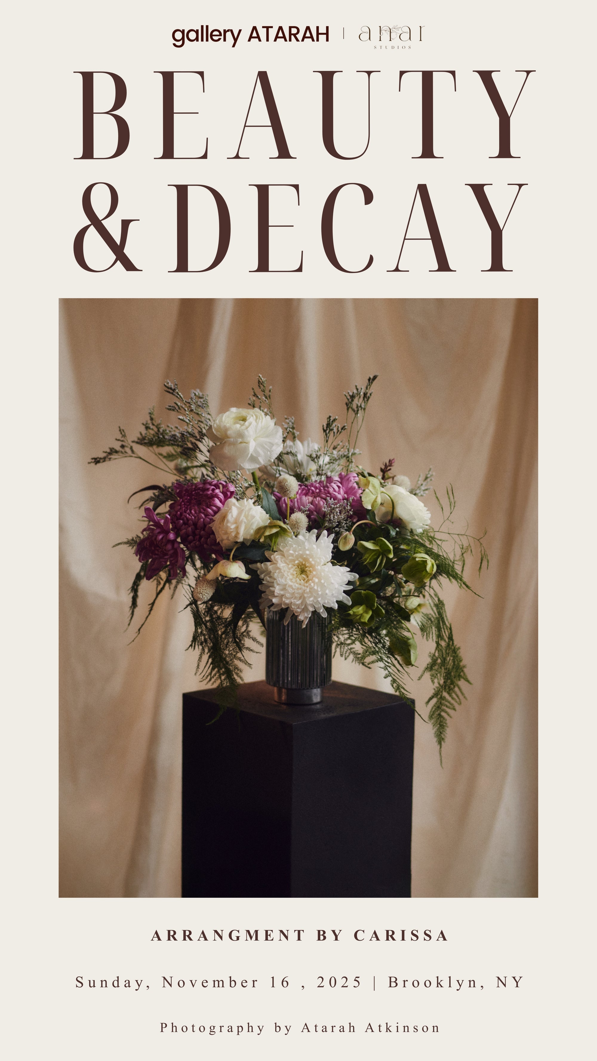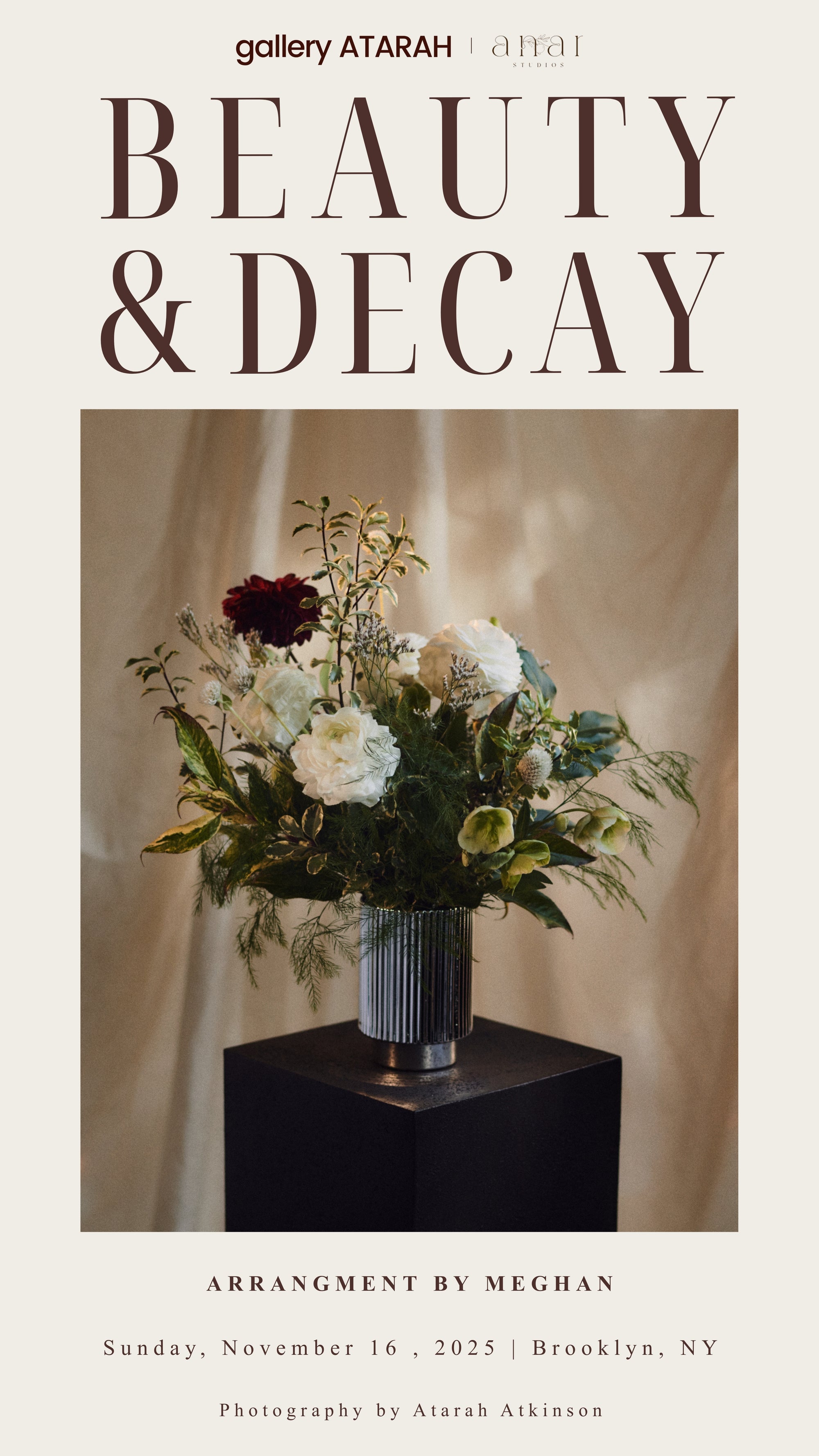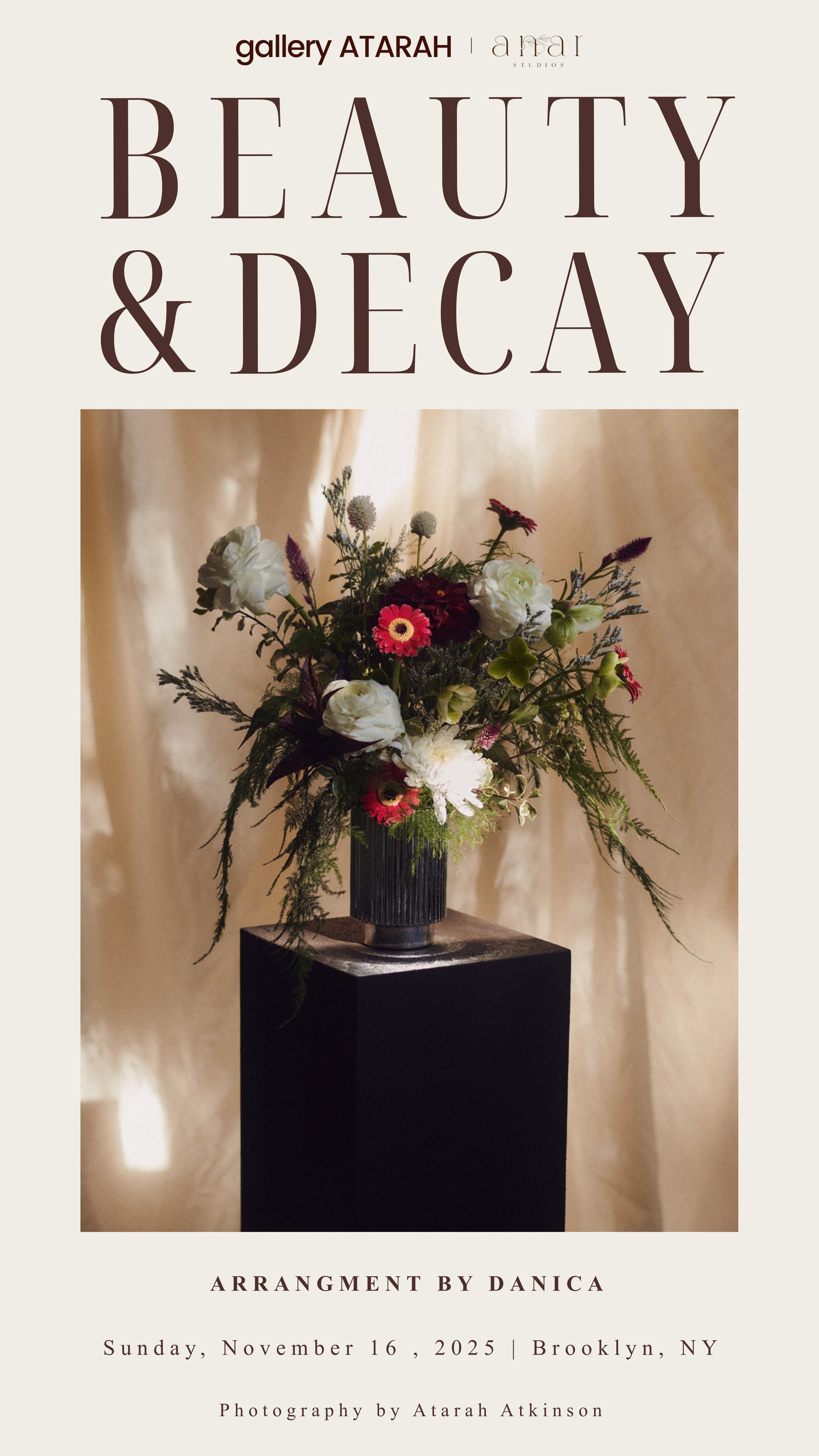 Timed to honor the transition out of summer into fall and winter—from fun and ecstasy into a season of reflection, slowdown, and sometimes grief—this workshop invites participants to pause rather than rush through change. Against the backdrop of Gallery ATARAH's inaugural exhibition "Bright Ruin," where everlasting art meets the ephemeral nature of living flowers, you'll be guided to create personal arrangements with respect to texture, shape, and spatial balance. Tawhida and Atarah will also invite you to partake in the act of self-reflection and vulnerability while making your piece of art.